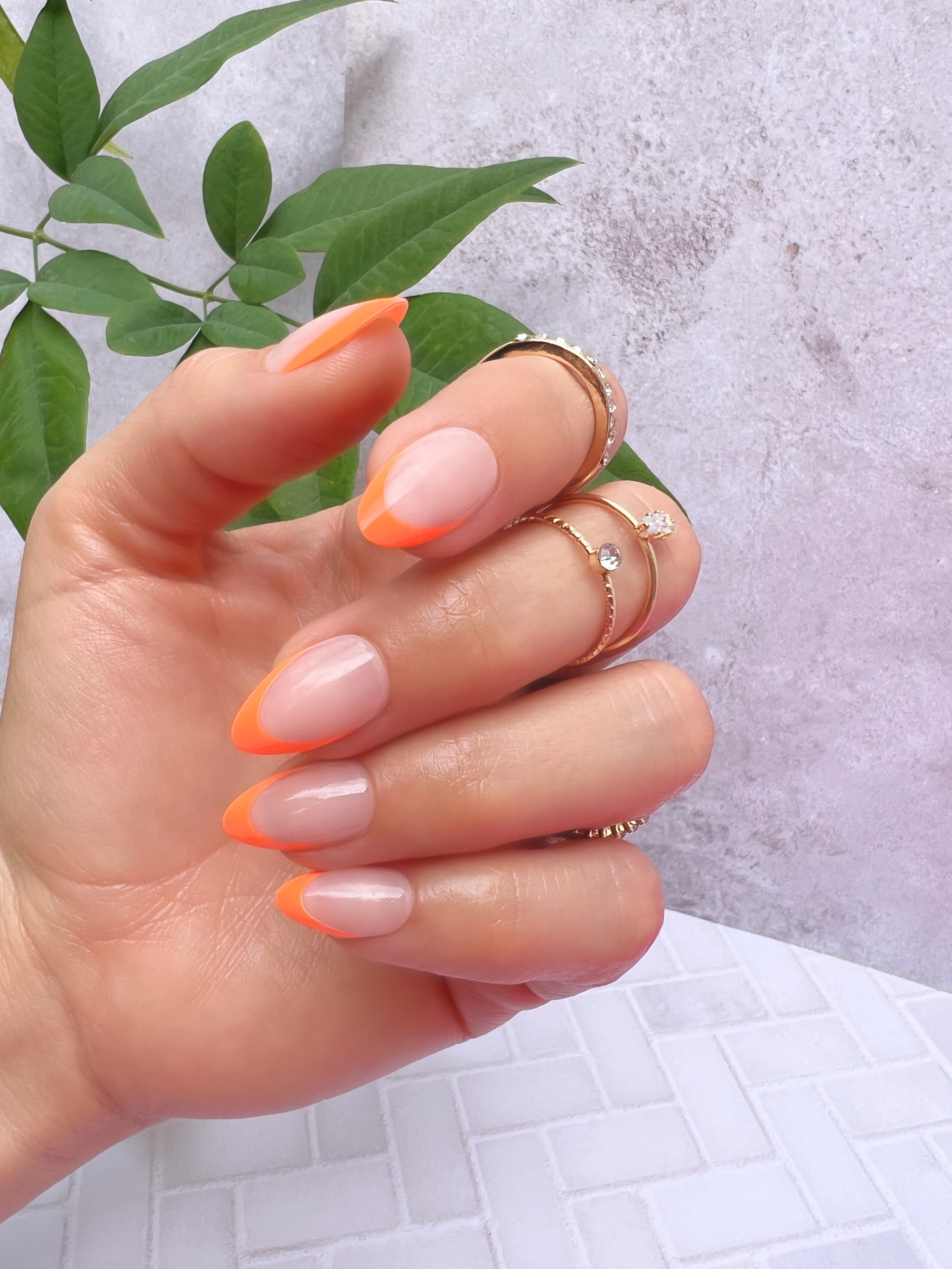 Short Almond. Neon Orange Classic French Tip. Glossy.